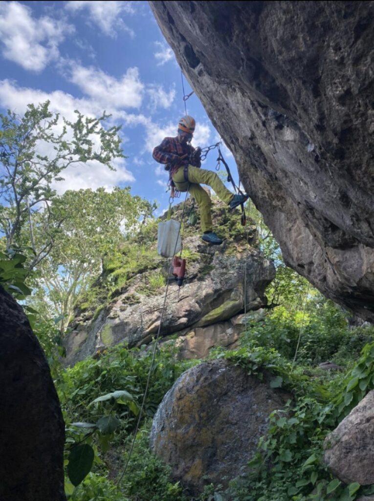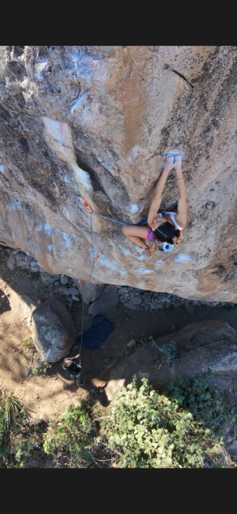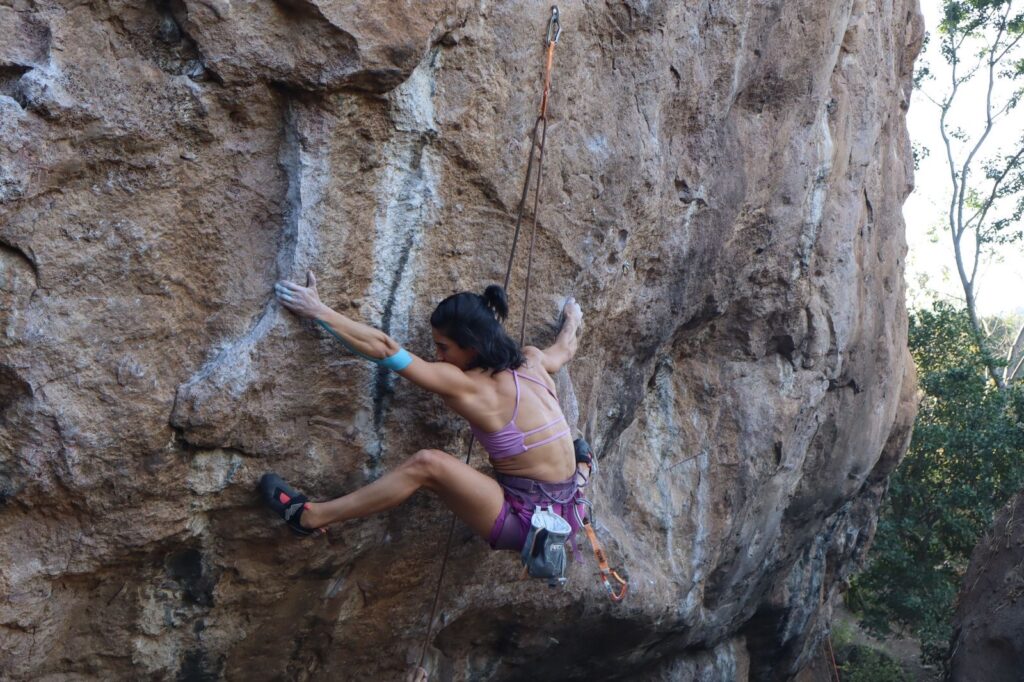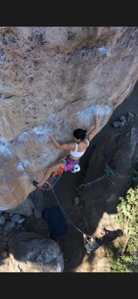 Con el gran entusiasmo que la caracteriza, Fery se descolgó en rappel, limpió la ruta, identificó los agarres y colocó las protecciones de la primera sección. Así nació su proyecto. La vía quedó dividida en dos secciones: Curcumina (5.13b) como entrada, y el verdadero corazón de la ruta: un boulder propuesto como V11 que conecta con el resto de la línea para crear Curcumina Power (5.14−).