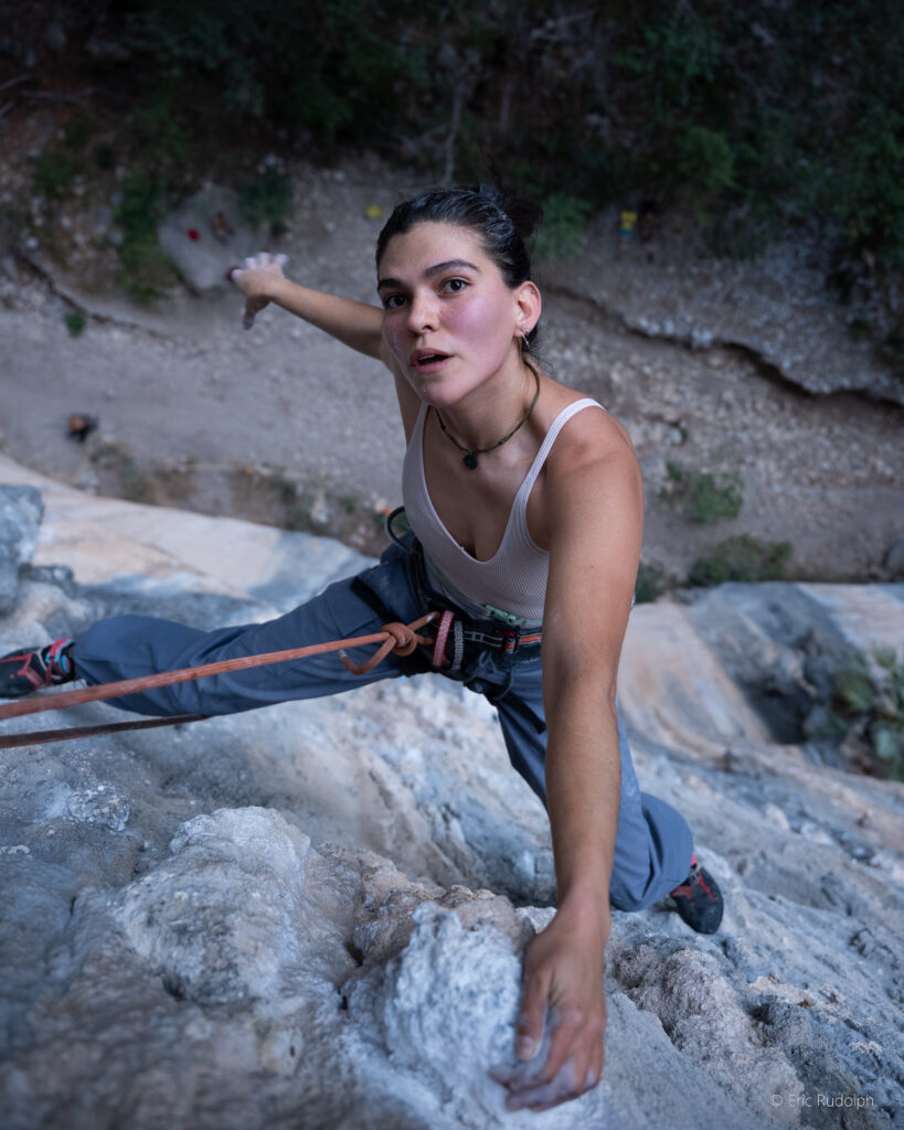Algo que queremos destacar es su espíritu explorador: fue la primera en abrir y encadenar Guerreras (5.12c), un multilargo en La Gloria. También la hemos visto divertirse en diferentes multilargos 5 estrellas como por ejemplo Sendero Luminoso (en potrero chico), cerca de El Salto. En el ámbito internacional, realizó el First Female Ascent (FFA) de Bravo les Filles (5.13d) junto a Sasha DiGiulian, una gran pared en Madagascar, desarrollado por @_linacolina_ hace 26 años. Logro que la ubica entre las escaladoras más completas y comprometidas de su generación.