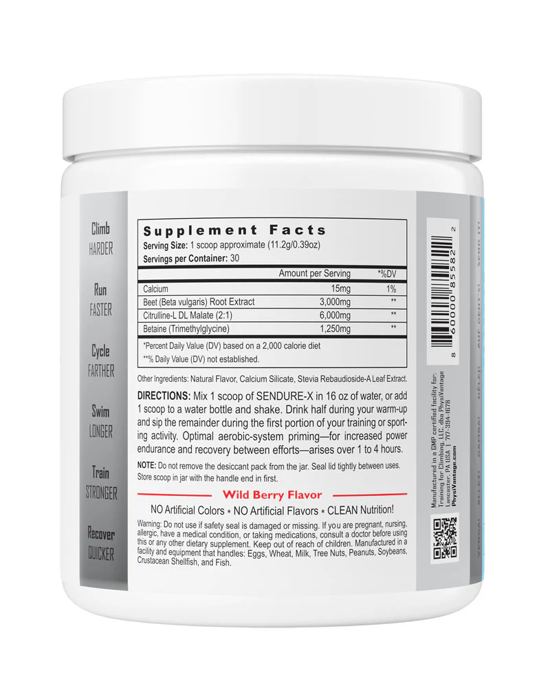 Sendure-X es un pre-entrenamiento a base de ingredientes totalmente naturales L-Citrulina DL-Malato (2:1), Extracto de raíz de betabel (Beta vulgaris) y betaína.